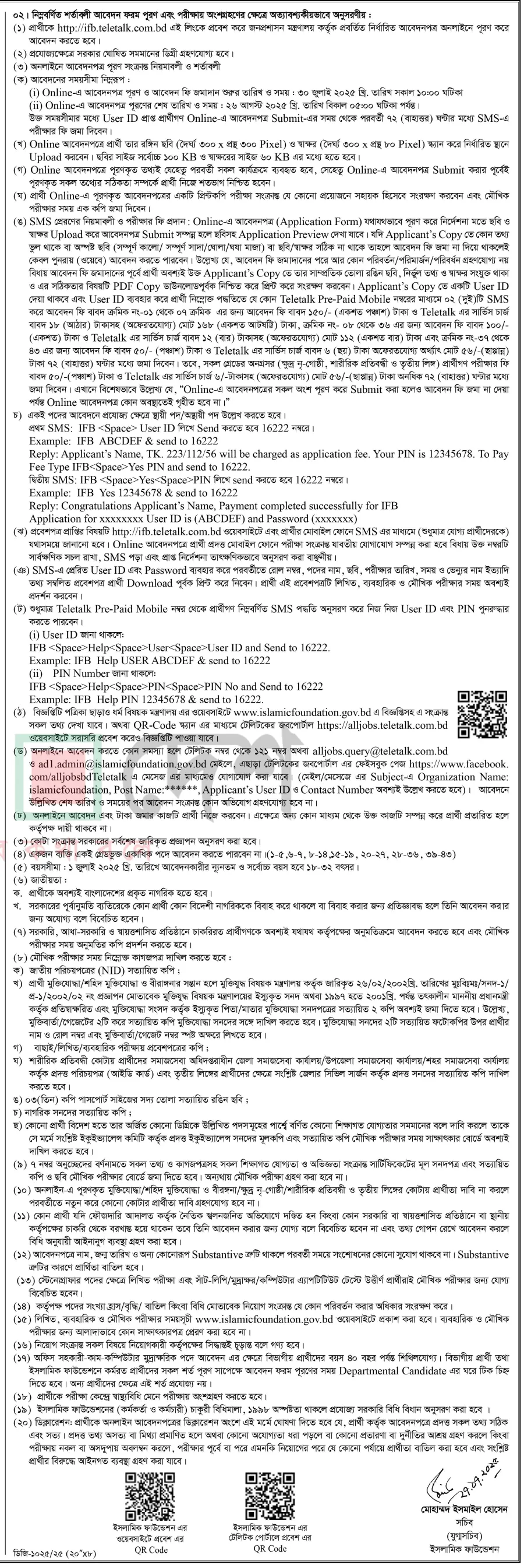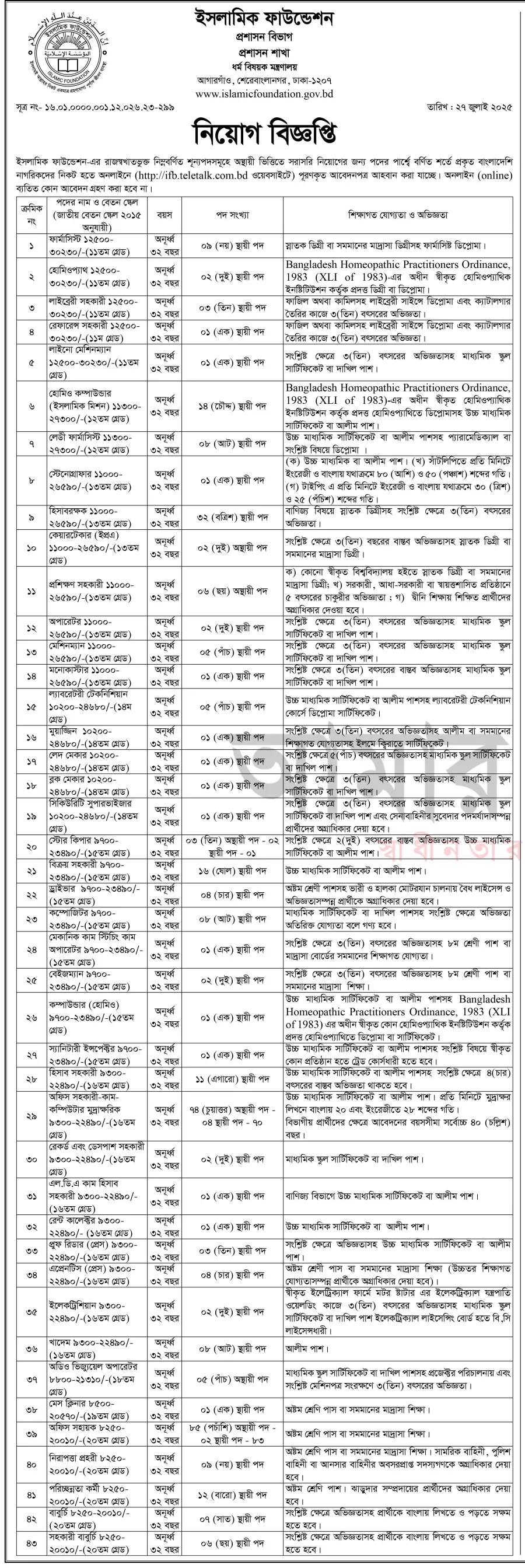 Islamic Foundation Job Circular 2025: ধর্ম বিষয়ক মন্ত্রণালয়ের অধীন ইসলামিক ফাউন্ডেশন শূন্য পদসমূহে জনবল নিয়োগের বিজ্ঞপ্তি প্রকাশ করেছে। ইসলামিক ফাউন্ডেশন ৪৩ টি পদে মোট ৩৬৩ জনকে নিয়োগ দেবে। পদ গুলোতে সকল জেলার প্রার্থীরা আবেদন করতে পারবেন। আগ্রহীরা অনলাইনে আবেদন করতে পারবেন। আগ্রহ ও যোগ্যতা থাকলে আপনিও আবেদন করতে পারেন। সম্পূর্ণ বিজ্ঞপ্তি বিস্তারিত দেওয়া হল।