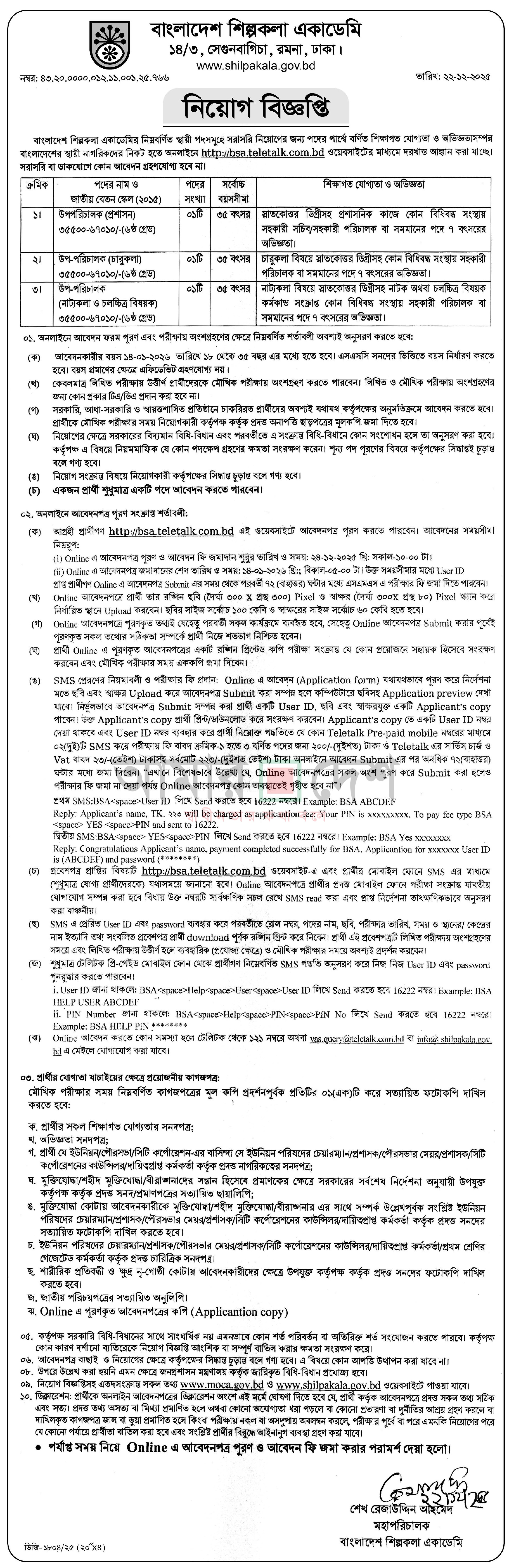 শিক্ষাগত যোগ্যতা: চারুকলা বিষয়ে স্নাতকোত্তর ডিগ্রিসহ কোনো বিবিধ সংস্থায় সহকারী পরিচালক বা সমমানের পদে ৭ বছরের অভিজ্ঞতা।