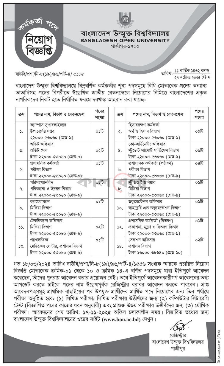বাংলাদেশ উন্মুক্ত বিশ্ববিদ্যালয় নিয়োগ বিজ্ঞপ্তি ২০২৫