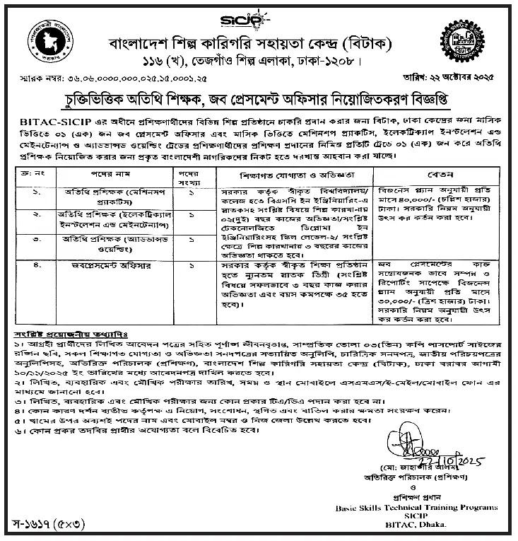 আবেদনের নিয়ম: আগ্রহী প্রার্থীদের স্ব-হস্তে লিখিত দরখাস্ত, পূর্ণাঙ্গ জীবনবৃত্তান্ত, সাম্প্রতিক তোলা ০৩(তিন) কপি পাসপোর্ট সাইজের রঙ্গিন ছবি, সকল শিক্ষাগত যোগ্যতা ও অভিজ্ঞতার সনদপত্রের সত্যায়িত অনুলিপি, চারিত্রিক সনদপত্র, জাতীয় পরিচয়পত্রের অনুলিপিসহ, অতিরিক্ত পরিচালক, বাংলাদেশ শিল্প কারিগরি সহায়তা কেন্দ্ৰ (বিটাক), বগুড়া বরাবর আগামী ১০/১১/২০২৫ ইং তারিখের মধ্যে আবেদনপত্র দাখিল করতে হবে।