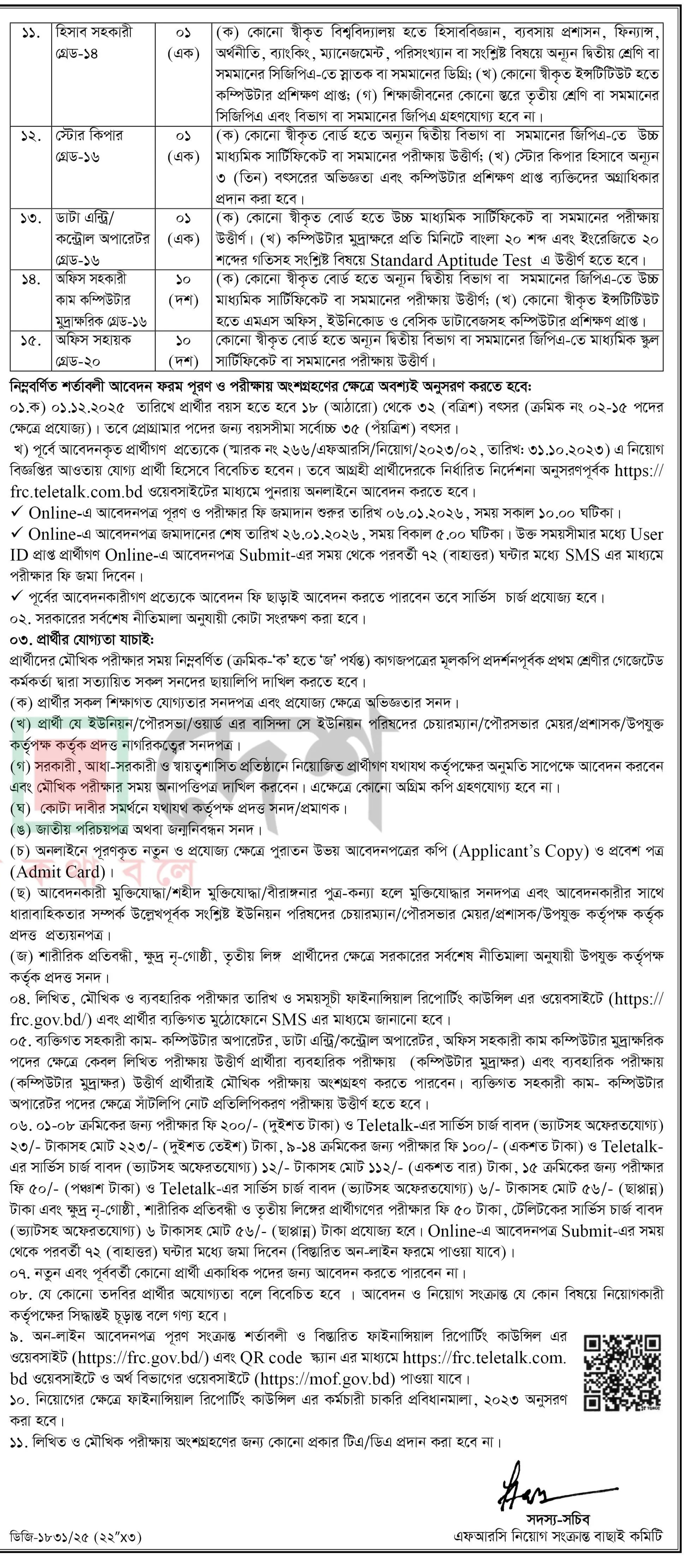 FRC Job circular 2026: অর্থ মন্ত্রনালয়ের আওতাধীন ফাইনান্সিয়াল রিপোর্টিং কাউন্সিলের বিভিন্ন শূন্য পদসমূহে জনবল নিয়োগের বিজ্ঞপ্তি প্রকাশিত হয়েছে। ফাইনান্সিয়াল রিপোর্টিং কাউন্সিল ১৫ টি পদে মোট ৫৭ জনকে নিয়োগ দেবে। আগ্রহী প্রার্থীরা অনলাইনে আবেদন করতে পারবেন। পদগুলোতে নারী ও পুরুষ উভয়েই আবেদন করতে পারবেন। আগ্রহ ও যোগ্যতা থাকলে আপনিও আবেদন করতে পারেন। সম্পূর্ণ বিজ্ঞপ্তি বিস্তারিত দেওয়া হল।