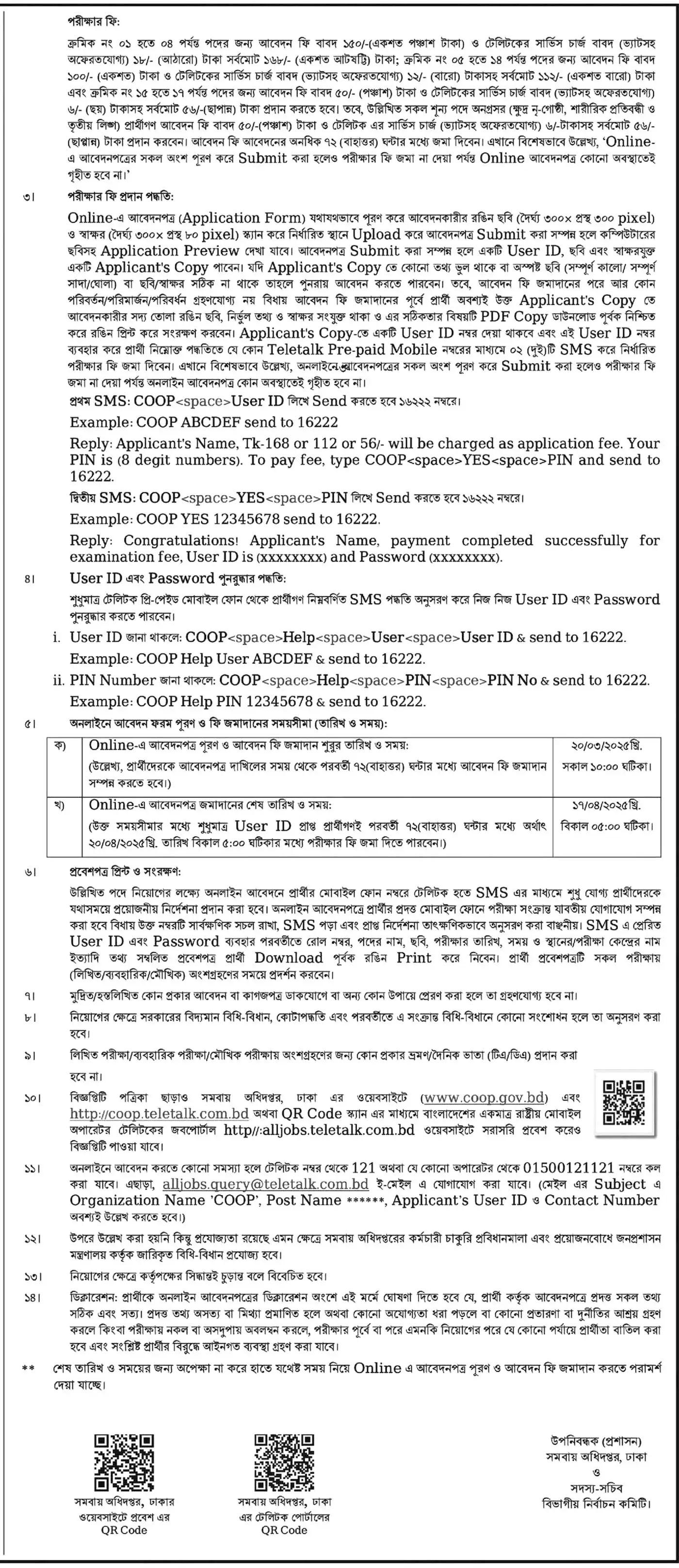 আবেদনের নিয়ম: আগ্রহী প্রার্থীরা অনলাইনে http://coop.teletalk.com.bd ওয়েবসাইটের মাধ্যমে আবেদন করতে পারবেন।