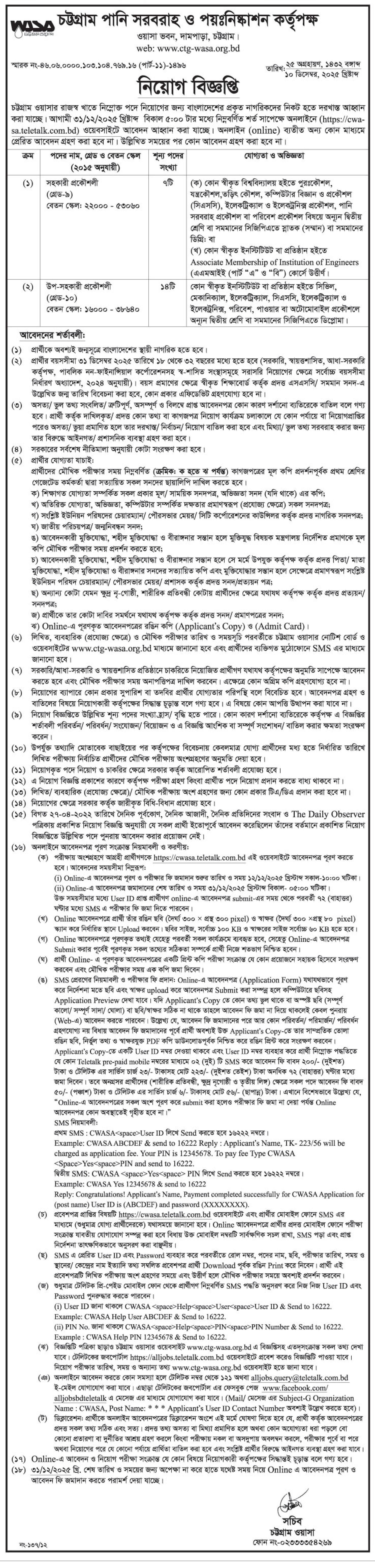 আবেদন প্রক্রিয়া: আগ্রহী প্রার্থীরা অনলাইনে http://cwasa.teletalk.com.bd এই ওয়েবসাইটে গিয়ে আবেদনপত্র পূরণ করতে পারবেন।