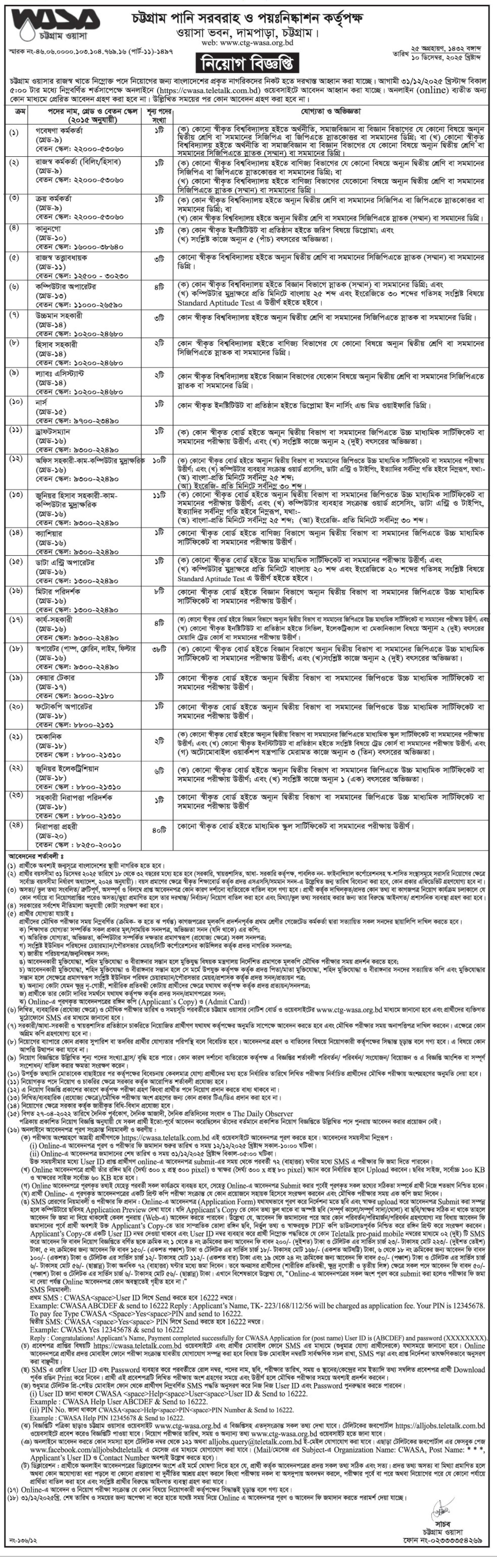 চট্টগ্রাম পানি সরবরাহ ও পয়ঃনিষ্কাশন কর্তৃপক্ষ (চট্টগ্রাম ওয়াসা) নিয়োগ বিজ্ঞপ্তি ২০২৫ অনুযায়ী পদের নাম, পদসংখ্যা, বেতন স্কেল, বয়সসীমা, শিক্ষাগত যোগ্যতা, অভিজ্ঞতা, আবেদন ফি, আবেদনের শেষ তারিখসহ সকল বিস্তারিত তথ্য নিচের দেওয়া অফিসিয়াল বিজ্ঞপ্তিতে উল্লেখ করা আছে। তাই কোনো গুজব বা ভুয়া তথ্যে বিভ্রান্ত না হয়ে অবশ্যই অফিসিয়াল বিজ্ঞপ্তি (PDF/ইমেজ) ভালো করে পড়ে নিন এবং সঠিক নিয়মে আবেদন করুন।